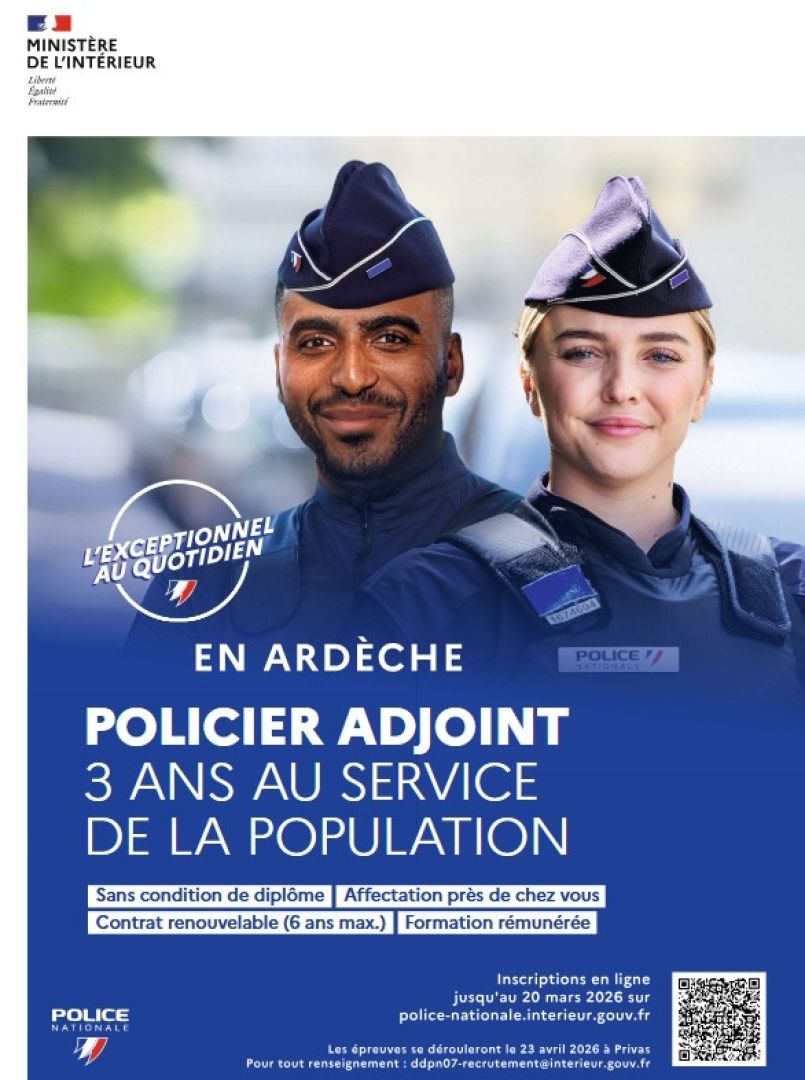 Inscription en ligne : https://www.police-nationale.interieur.gouv.fr/nous-rejoindre/inscriptions-aux-concours-et-selections/policier-adjoint-sud-est-departement-de-lardeche-07