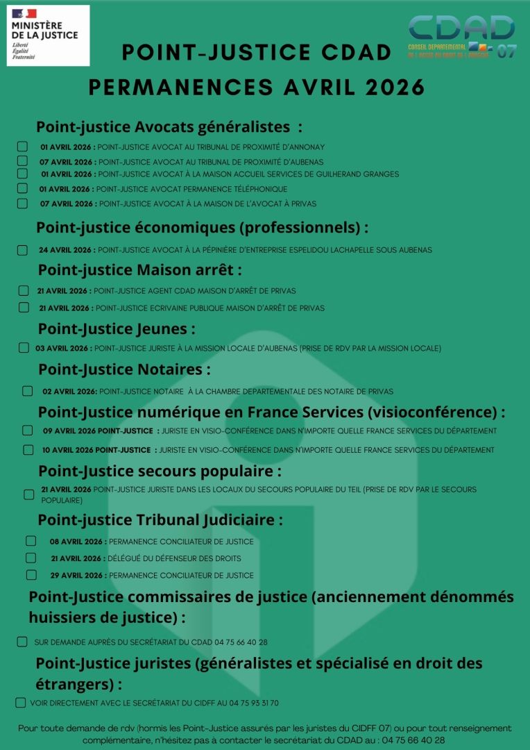 • 07 avril 2026 : point-justice avocat au Tribunal de proximité d’Aubenas