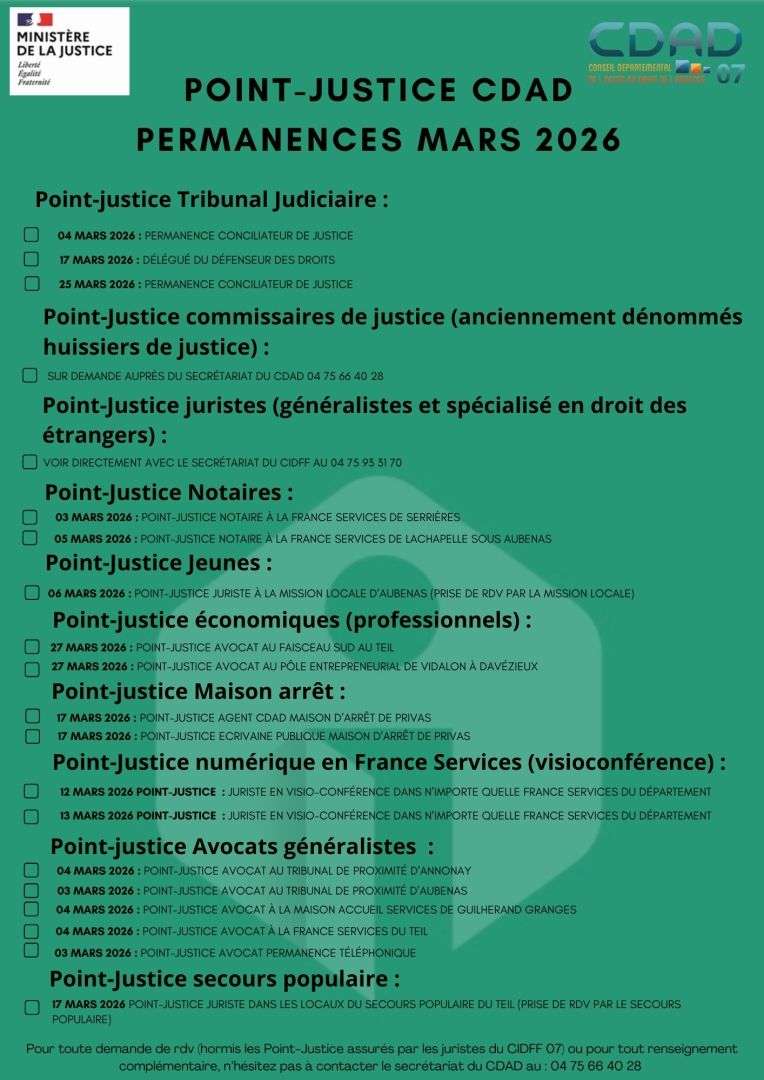• 03 mars 2026 : point-justice avocat au Tribunal de proximité d’Aubenas